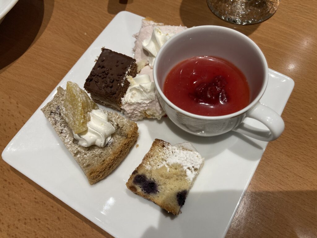カットフルーツはなくて残念でしたが、ケーキやムース、コーヒーゼリーなどそこそこ種類もあり美味しく満足度の高いデザートでした♫